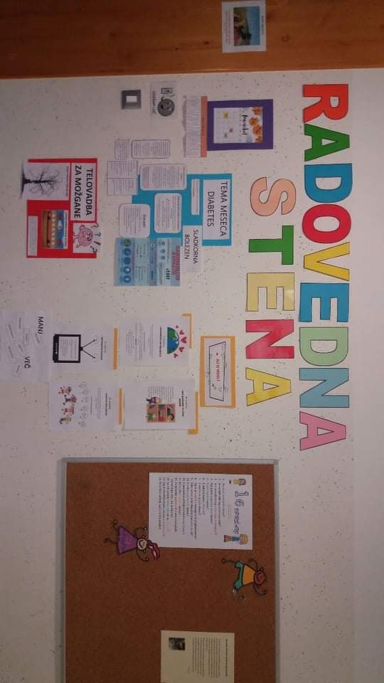Ob začetku šolskega leta smo z učiteljicami razmišljale, kako bi šolo čim bolj polepšale. Ena izmed idej je bila, da naredimo radovedno steno, ki se bo vsak mesec ''osveževala''. Radovedna stena je sestavljena iz večih delov, in sicer učenci in starši na njej najdejo naslednje rubrike: